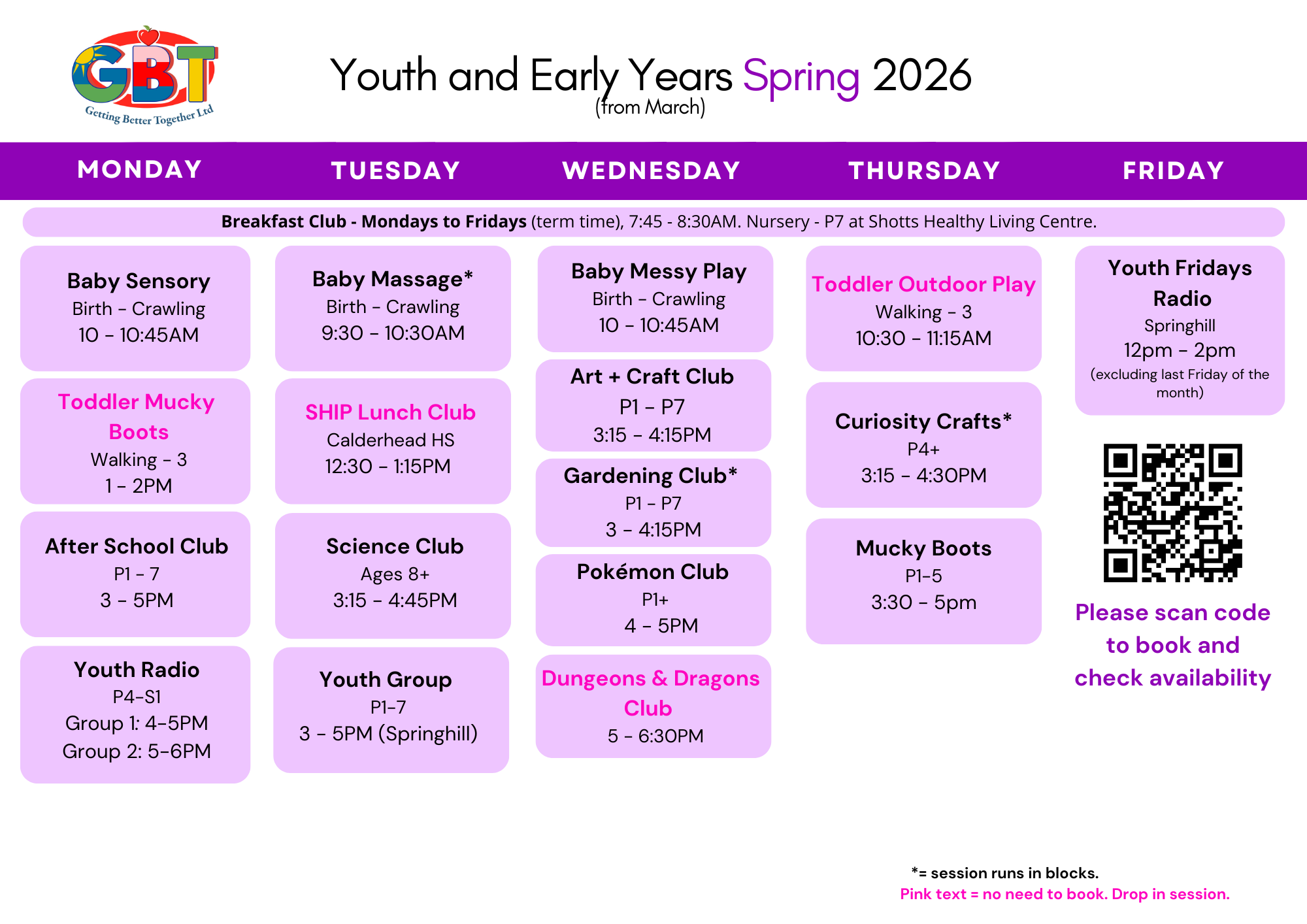 Open to Primary 5 to 1st Year pupils (flexible) on Monday nights between 4pm and 6pm at Springhill Community Hub.