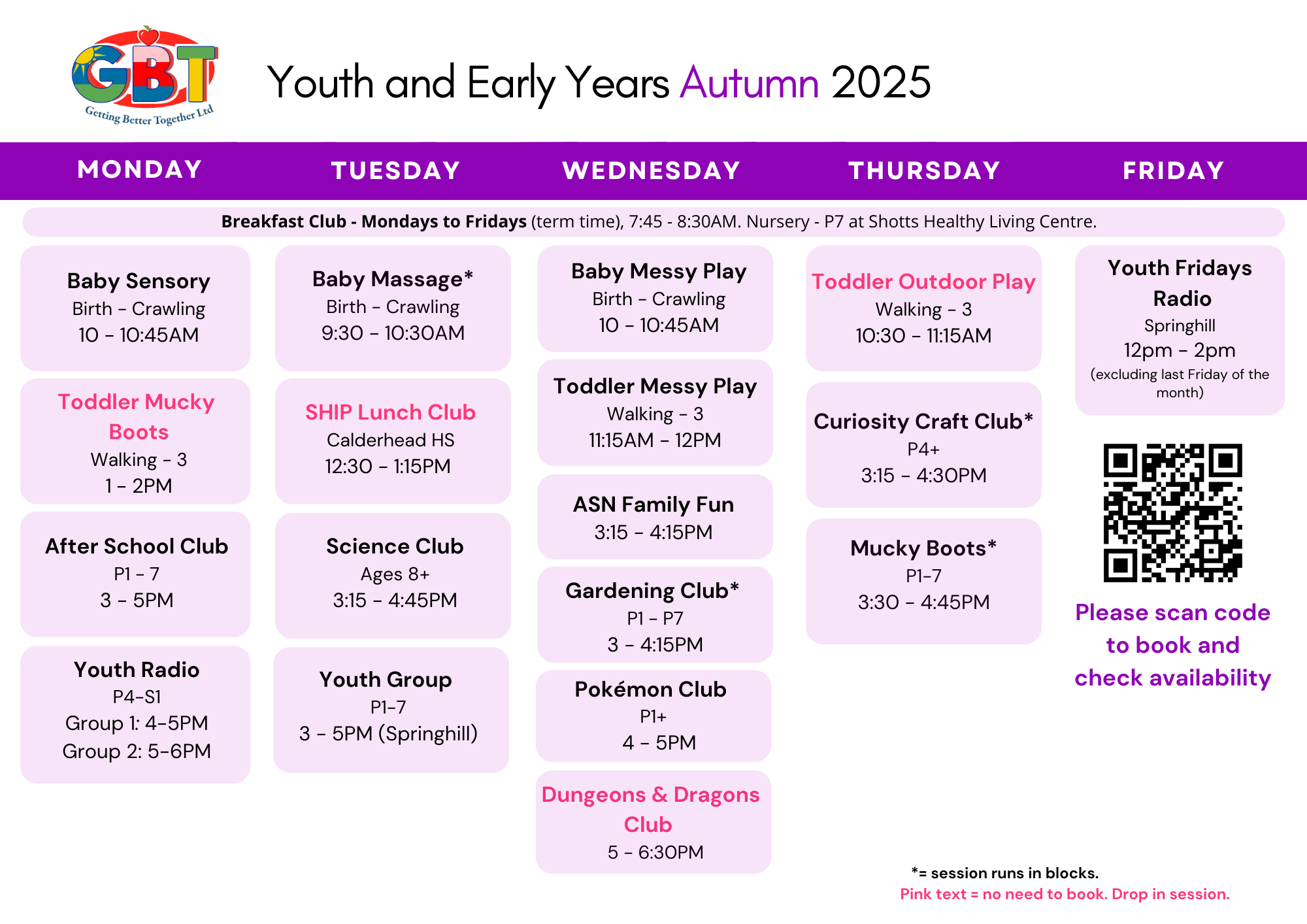 Open to Primary 5 to 1st Year pupils (flexible) on Monday nights between 4pm and 6pm at Springhill Community Hub.